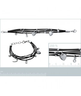 Bracelet composé de 6 fils en cuir noir, 2 coeurs, 2 perles pendantes et 2 brillants oxyde de zirconium brillants. Fermoir mousqueton avec chaîne de réglage. Longueur : 22 cm. Livré dans sa jolie pochette en organza.