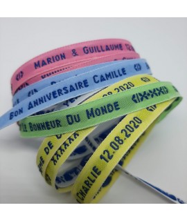Étiquettes tissées à coudre • Fond gris / Texte bleu • Marquage vêtement nom prénom • bracelets message