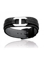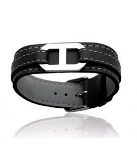 Superbe bracelet en acier et cuir noir, fermeture ceinture. Longueur : 22 cm environ. Largeur : 18 mm. De toute beauté, très chic ! Coutures blanches visibles, tout est dans le détail... Livré dans sa jolie pochette en organza.