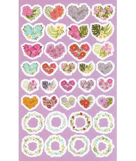 Grande feuille d'autocollants sur le thème "coeurs et couronnes de fleurs".